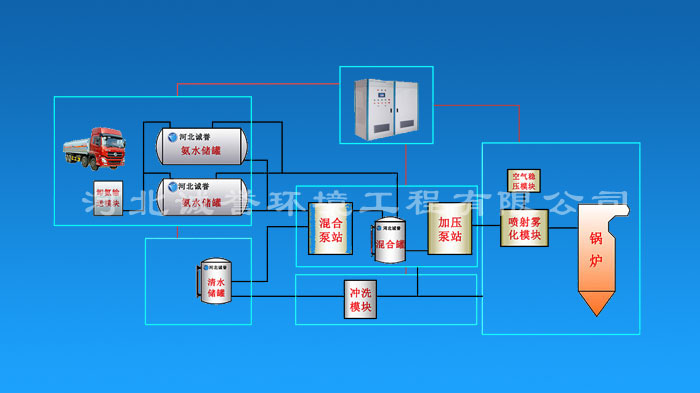 如此,即可確保氨水脫硝系統(tǒng)的安全性,才可使氨水最終順利進(jìn)入噴射霧化模塊,由氨水脫硝噴槍噴出,對鍋爐煙氣進(jìn)行脫硝處理。