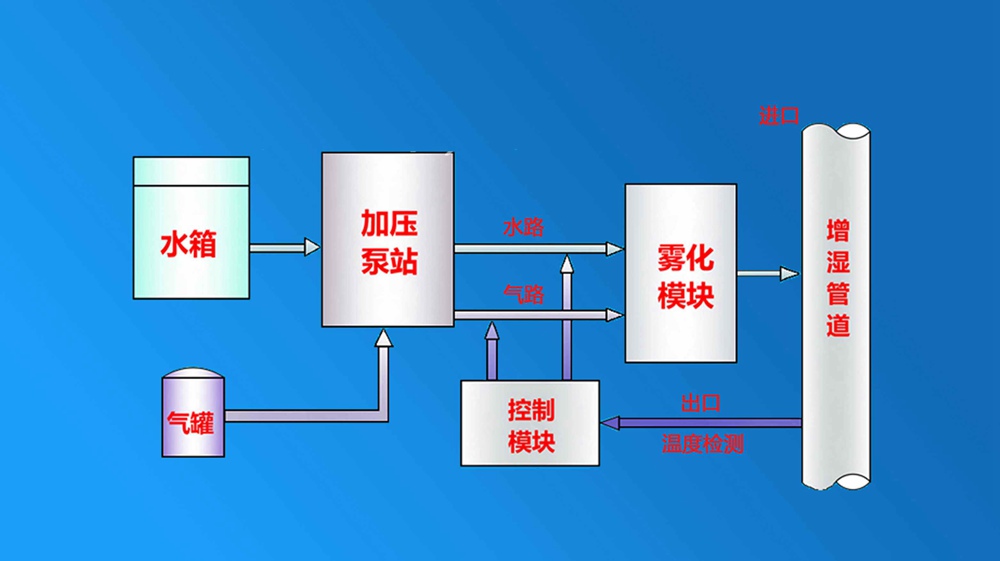 系統(tǒng)結(jié)構(gòu):該系統(tǒng)霧化噴槍固定在增濕塔錐體部位,整套設(shè)備由四部分構(gòu)成:一是壓縮空氣供應(yīng)系統(tǒng),與主排風機相連接;二是加壓供水系統(tǒng)。由立式多級離心泵帶電機和整套精密低壓閥門、過濾器等附件組成;三是增濕塔頂部霧化系統(tǒng)。由增濕塔頂部環(huán)管、噴槍、噴嘴、高壓伸縮軟管及精密閥門、過濾器等連接件組成。四是多功能控制系統(tǒng)。由氣、水壓力、溫度、流量測控器,低壓元器件和變頻器等組成完整閉路控制系統(tǒng)。